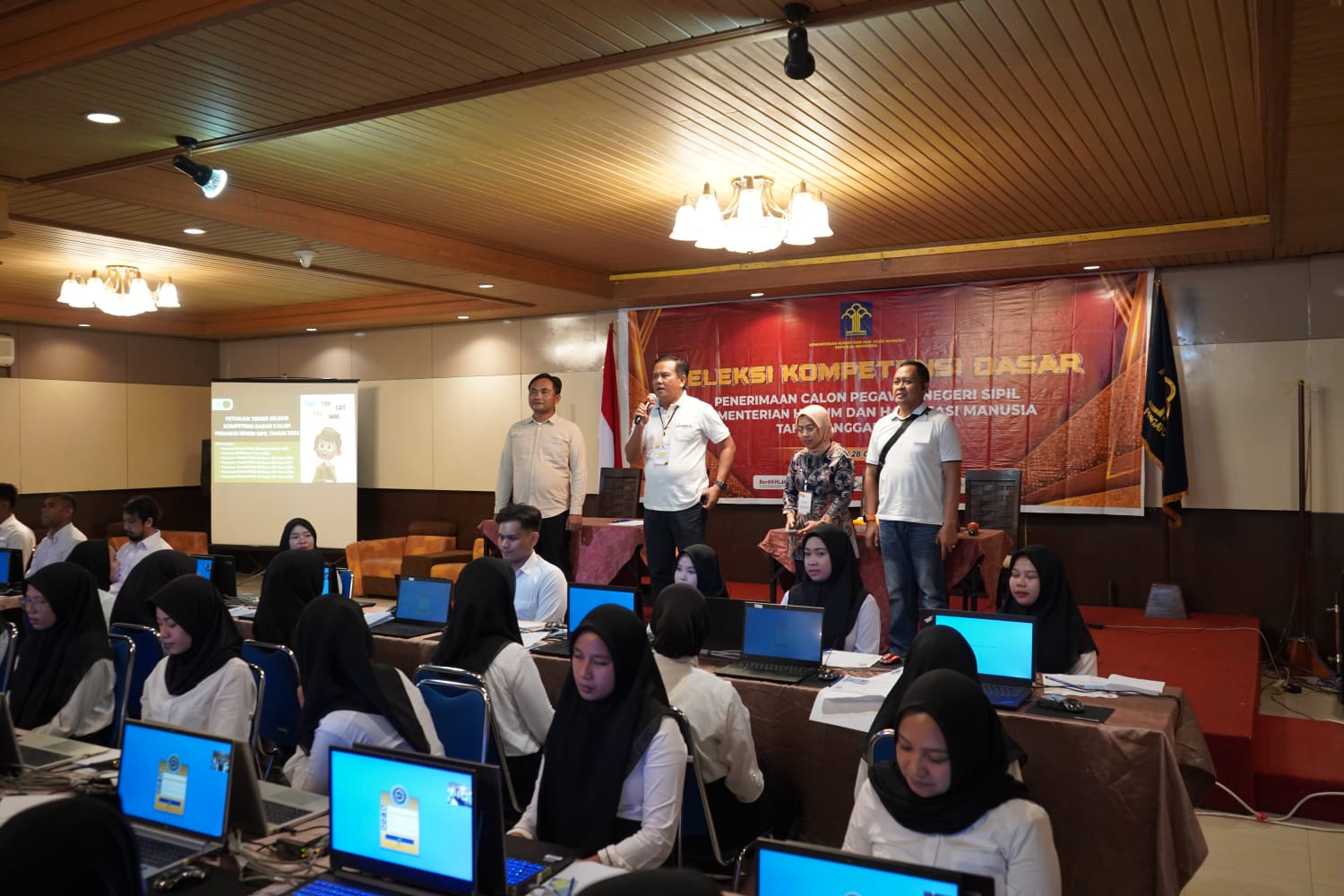 KENDARI, tirtamedia.id – Pelaksanaan hari pertama Seleksi Kompetensi Dasar (SKD) CAT-BKN Tahun 2024 di Lingkungan Kantor Wilayah Kementerian Hukum dan HAM Sulawesi Tenggara berlangsung di Hotel Athaya, Kota Kendari, pada Sabtu (17/10/2024).