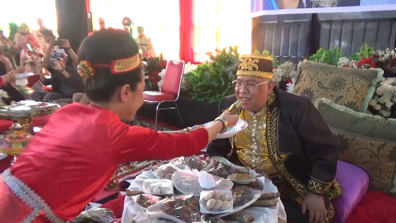 Dalam kunjungannya, Deputi Kemenparekraf RI bersama dengan pejabat lainnya, disambut langsung oleh Gubernur Sultra, Ali Mazi dengan tradisi adat Kande-kandea atau Jamuan, di Aula Kesultanan Buton, Kota Baubau, Minggu (22/05/2022).