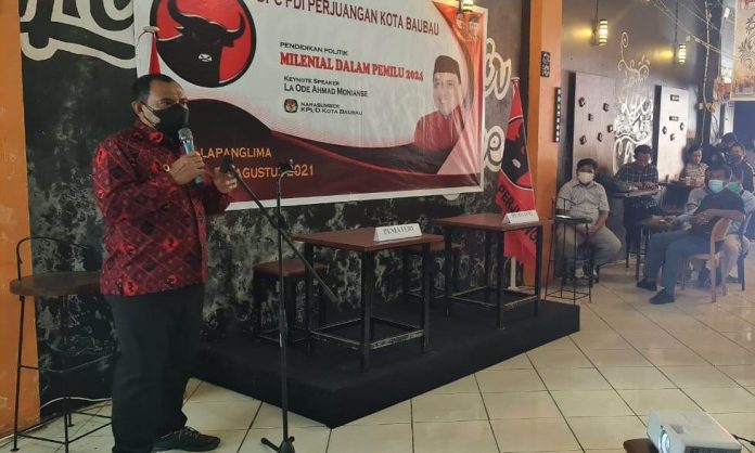 BAUBAU, tirtamedia.id – Ketua Dewan Pimpinan Cabang (DPC), Partai Demokrasi Indonesia Perjuangan (PDIP) Kota Baubau, La Ode Ahmad Monianse, diskusi bersama generasi milenial, pada salah satu Warkop di Kota Baubau, Sulawesi Tenggara (Sultra), Sabtu (14 Agustus 2021).
