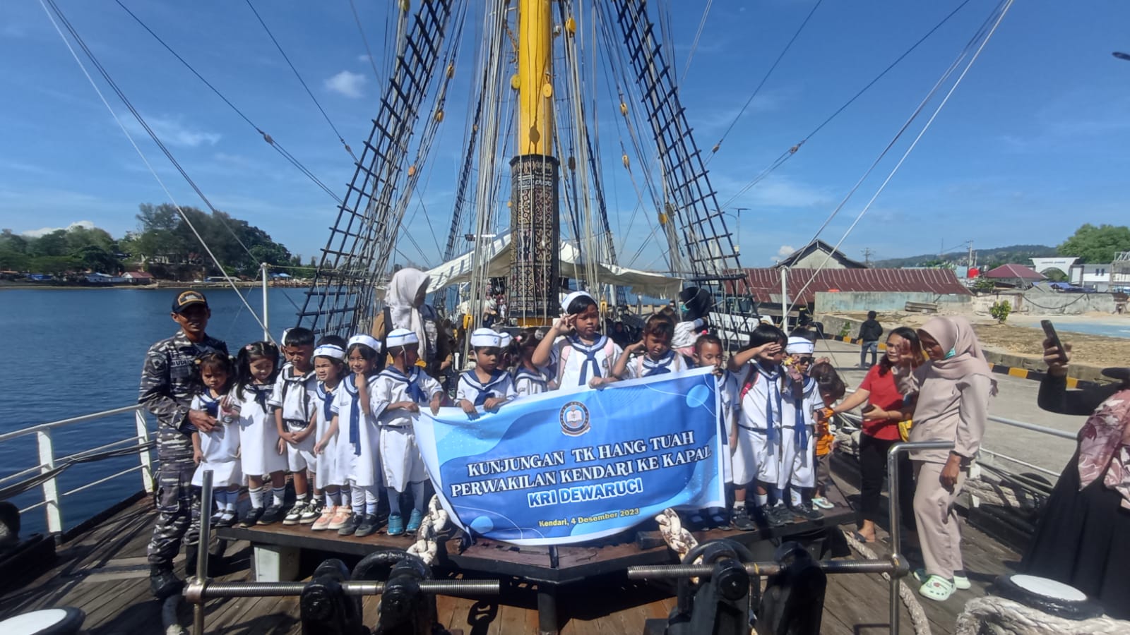 Murid TK Hang Tuah Kendari berkunjung di Kapal Perang Republik Indonesia (KRI) Dewaruci yang berlabuh di Dermaga Mako Lanal Kendari.
