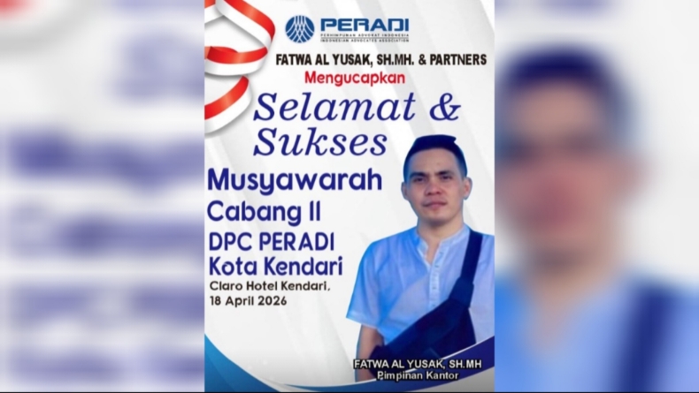 Rencananya, Muscab II Perhimpunan Advokat Indonesia (Peradi) Kendari akan digelar di Hotel Claro, Sabtu (18/4/2026).
