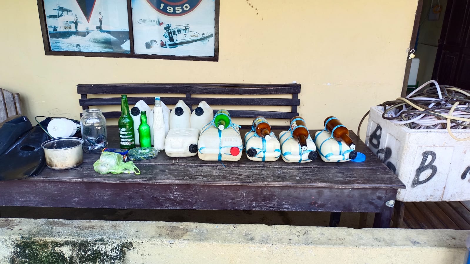 Dari tangan para pelaku, polisi menyita 4 buah jergen yang berisikan bahan peledak, 6 buah botol kaca berisi bahan peledak, 2 buah sumbu, 5 buah obat nyamuk bakar, 9 buah korek kayu, kacamata selam, kapal kayu jenis jolor, sampan, kompresor, selang kompresor, dan 2 buah kaki katak.